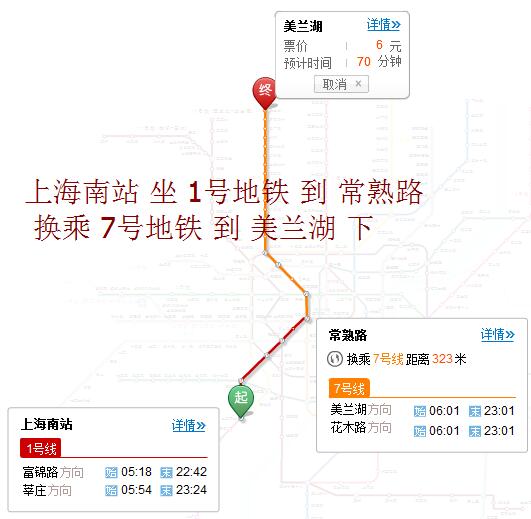 上海南站 坐 1號地鐵 到 常熟路 換乘 7號地鐵 到 美蘭湖 下