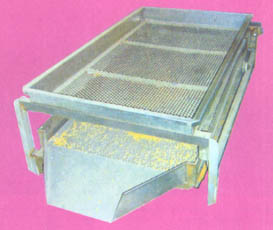 該機(jī)由機(jī)座、參振兩部份組成。振動(dòng)電機(jī)分別安裝在直線篩的長(zhǎng)方形篩架兩側(cè),通過彈性橡膠連接產(chǎn)生振動(dòng),調(diào)節(jié)振動(dòng)電機(jī)內(nèi)和重塊相位角,可以提高振幅和激振力,因此,可單層或多層(六層)任意使用,又因機(jī)座裝有升降桿,可調(diào)節(jié)直線篩的篩面傾斜角度,達(dá)到理想的篩分效果。振動(dòng)電機(jī)作為振動(dòng)源,使物料在篩網(wǎng)上拋起,不斷地跳躍全面鋪開,同時(shí)向前作直線運(yùn)動(dòng)。篩網(wǎng)架底部裝有托底,并分成若干格子,每格內(nèi)均放有數(shù)只橡膠球,使之在振動(dòng)時(shí)產(chǎn)生撞擊,達(dá)到清網(wǎng)的作用,解決了物料睹眼現(xiàn)象。儲(chǔ)料斗啟閉靈活,能正確地控制物料的流量,均勻地進(jìn)入絲網(wǎng)全面鋪開,使絲網(wǎng)得到充分的利用,保證了物料的篩分精度和篩分產(chǎn)量。