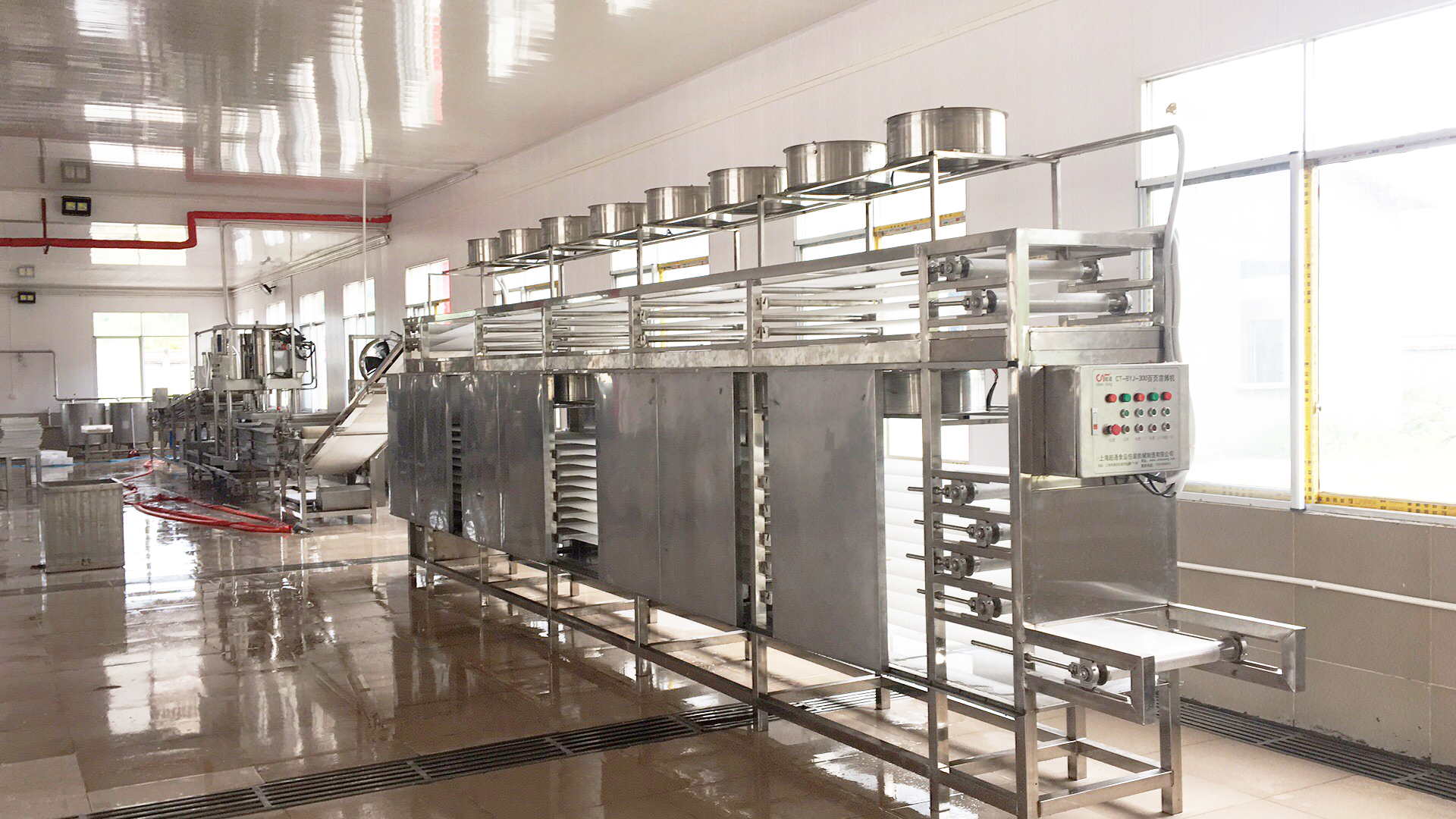 本生產(chǎn)線由豆腦輸送管線、即時破腦澆注機、自控壓機、剝布機、攤涼機等組成。整個工藝過程是:豆?jié){由凝固機小桶點漿凝固成豆腦,再由輸送管線不破腦輸送到破腦器進行即時破腦即時澆注折疊,從而達到傳統(tǒng)手工效果,出品率高,韌性好。