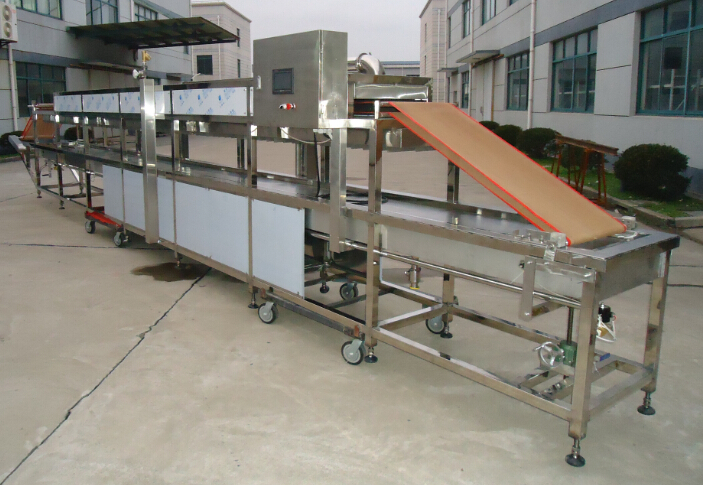 該設(shè)備由傳送皮帶、烘干機(jī)、蒸發(fā)鍋、傳送電機(jī)、冷風(fēng)管、電控箱、蒸汽表等部分組成。此設(shè)備為自動(dòng)流水線設(shè)備,豆?jié){放入蒸發(fā)鍋后,經(jīng)保溫吹涼過程,將鍋表面結(jié)皮的產(chǎn)品送入輸送帶,自動(dòng)卷起、烘干一體機(jī),如此反復(fù),至將豆?jié){全部加工完畢。